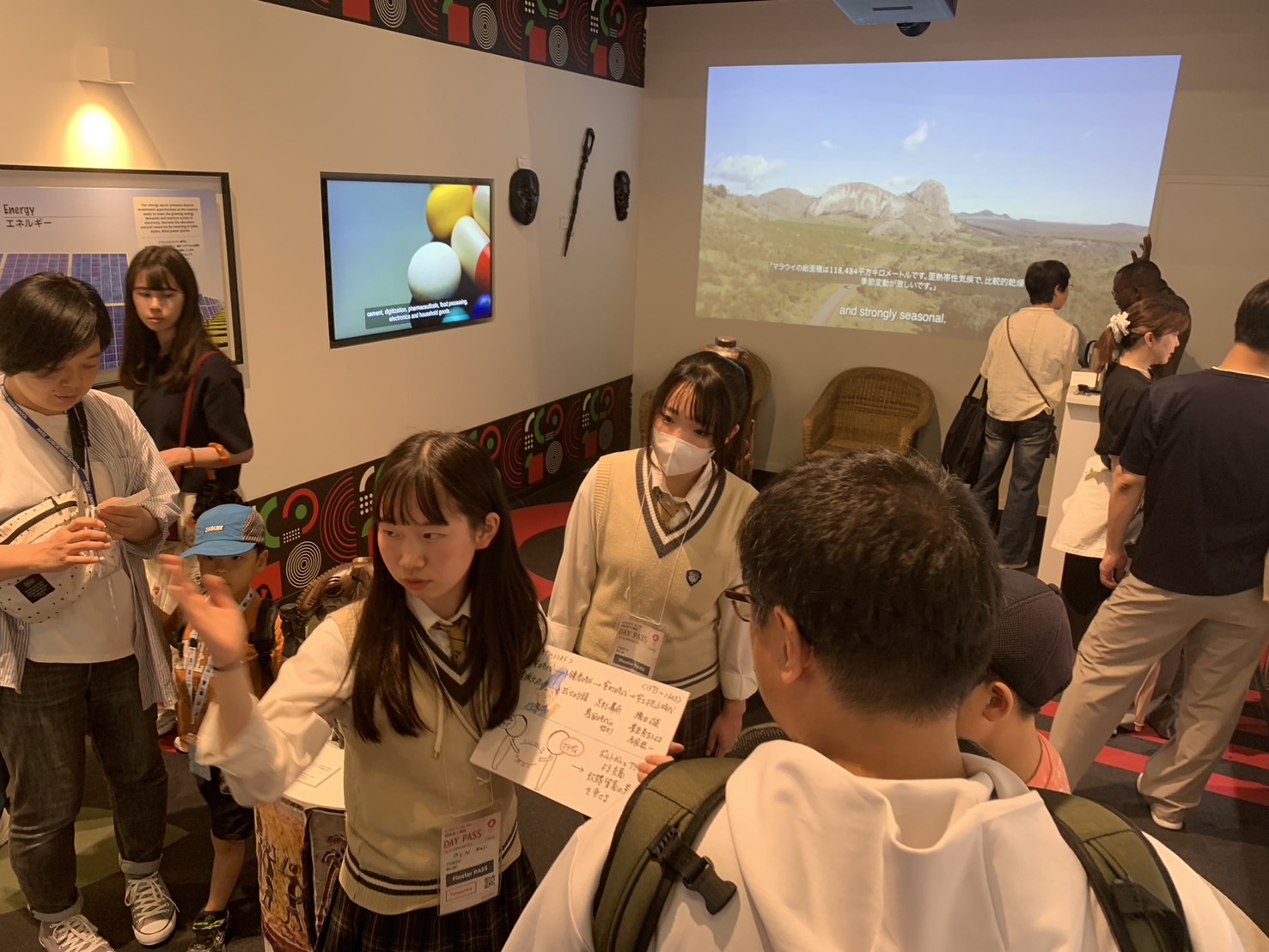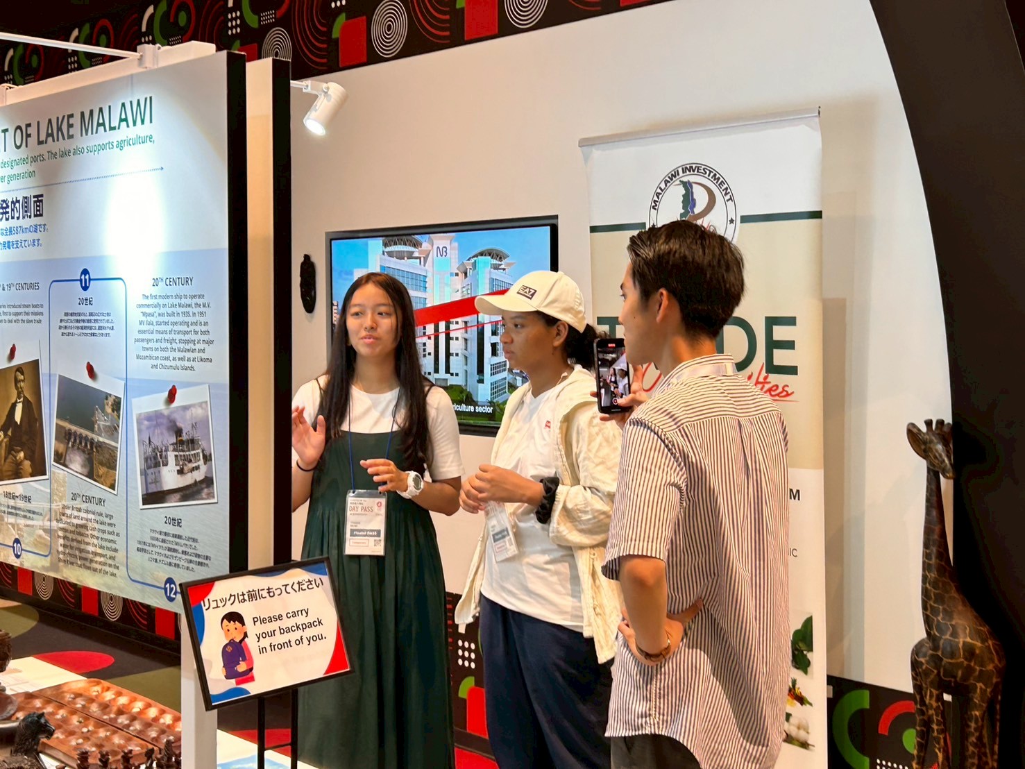 下部の「Malawi × Kansai」のロゴは、パビリオンで展示されていたコーヒーが、現在も関西の学生たちを始め、 日本の皆様の手によって支援の源泉となり続けていることを示しています。