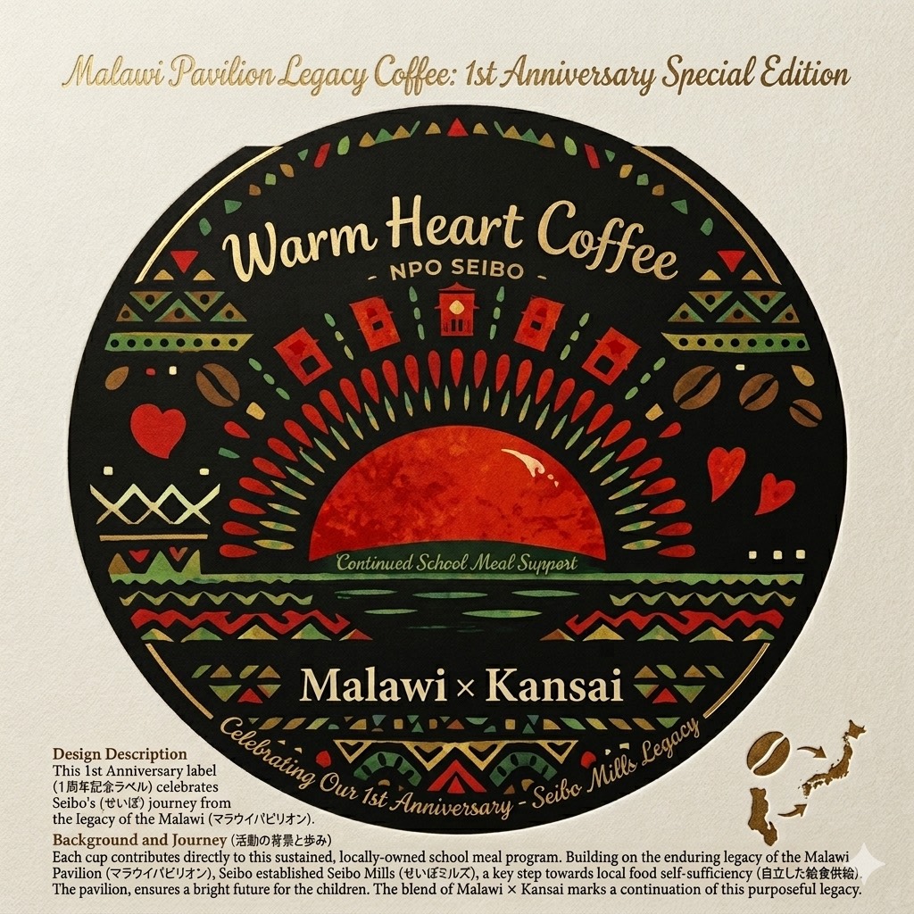 この1周年記念ラベルが付いたコーヒーを手に取ることは、パビリオンから始まった物語の続きを共に書くことを意味します。売上は直接、マラウイの子供たちの給食費として届けられます!